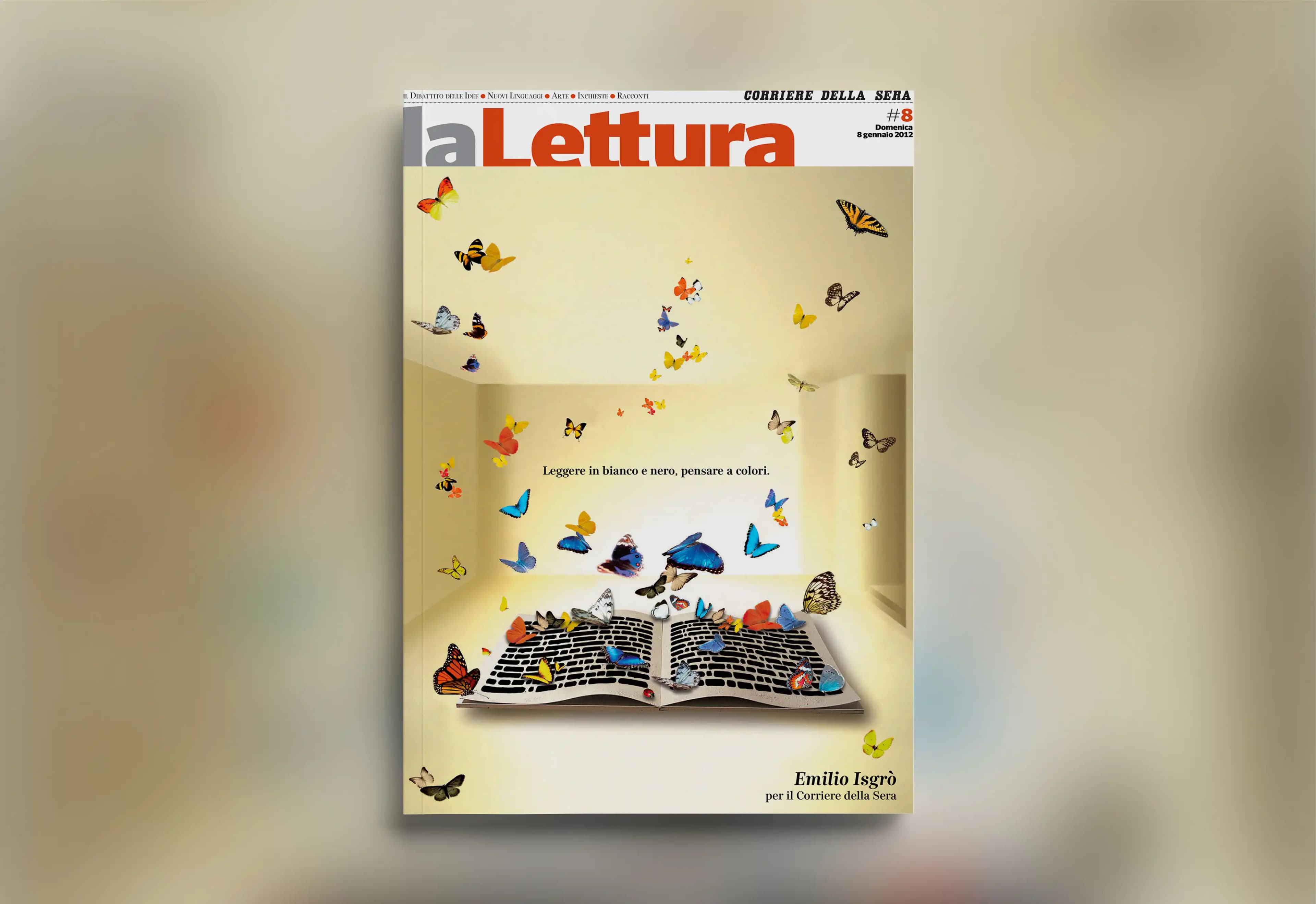 In 2022 la Lettura, launched a unique digital initiative transforming artist-designed covers into NFTs (Non-fungible Tokens).The initiative inaugurated with "Le Farfalle Sapienti" (The Wise Butterflies), a symbolic representation by Emilio Isgrò, as the cover for La Lettura #8, originally published in its physical format on January 8th, 2012. In this piece, colorful butterflies take flight from the pages of a book, embodying the boundless thoughts ignited by a compelling read. The artwork, now an NFT, epitomizes Isgrò's hallmark erasure technique, illustrating a delicate interplay between the visible and the invisible, the concealed and the revealed.